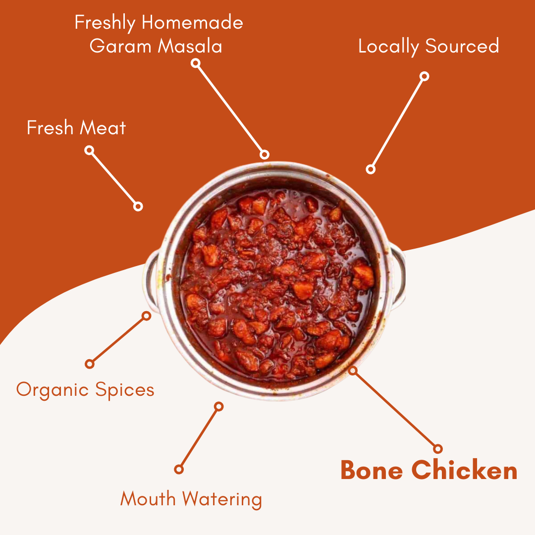 Andhra Chicken Pickle, particularly the version with bone, is a spicy and flavorful side dish originating from Andhra Pradesh, India. It typically features tender, slow-cooked chicken (often country chicken, "naatu kodi") that's been marinated in a powerful blend of hand-ground spices, fiery red chilies, and often cold-pressed gingelly oil. The resulting pickle is a perfect complement to rice, dosa, or even enjoyed on its own as a snack,